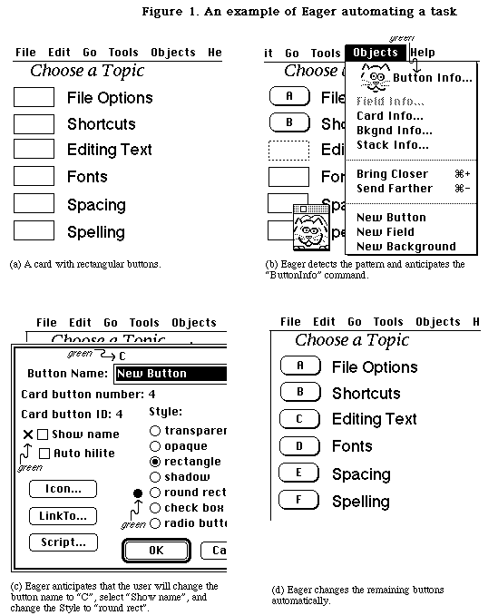 Figure 1 demonstrates a repetitive task that is automated by the Eager program. The example shows part of the process of creating a "Help" card: the intent is that clicking on the button to the left of a topic will bring up a screen of information about that topic. In the example, the user changes the appearance of the buttons: they are to be rounded rectangles, displaying the letters A, B, C, etc. The user changes the buttons one at a time. The first button is changed with the following commands in HyperCard: