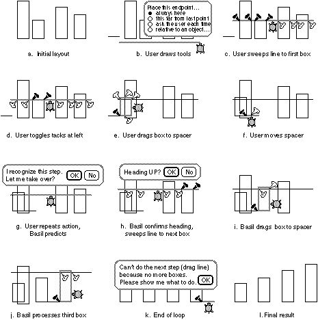 When Pam picks the sweepline a second time, Basil detects repetition and predicts a loop, offering to do the next step (2g). She assents; Basil confirms the direction of search (2h) and sweeps the line up to the next shortest box. Basil picks this box, rather than return to the first one or choose one at random, because it inferred three things from the first example: that it should choose a box not encountered before; that it should scan upwards; and that it should pick the first one in its path.