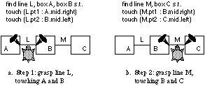 The rules assign each touch to one of eight levels of significance. The highest level, "determining," specifies particular objects and points of contact, thus exactly determining where Basil should move (no touches like this occur in the action above, but the contact between the box and the spacer in Figure 3d is determining). Lower levels represent increasing degrees of freedom in the choice of coordinates, as when moving a line so that any part of it crosses some vertex: the constraints above are of this type. The lowest level, "trivial," hold by definition.