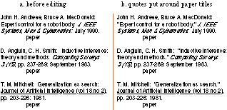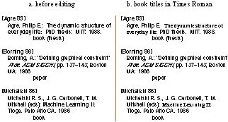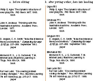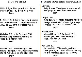 This next example introduces a new case, multiple authors (see the third entry in Figure 1). Turvy's search pattern was "word before first colon in the paragraph," which selects the last author. Note that Turvy rejects the generalization "any punctuation" for two reasons: words before periods ("E.", "H.") were not given as examples; and Kate said "comma."
