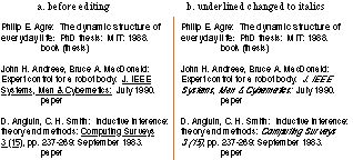 Turvy's domain knowledge and language understanding are quite primitive. We tested our simulated Turvy on bibliography editing tasks, but Turvy knows nothing about bibliographies. Users have to teach concepts like "surname" as syntactic patterns like "word before colon before italic text." Although a real instructible agent might have built-in knowledge about bibliographies, as in Tourmaline (Chapter 14), users in real situations will be teaching arbitrary new concepts, so we chose to test Turvy's ability to learn from scratch. Turvy's background knowledge, a collection of pattern matchers and generalization hierarchies for syntactic features, appears feasible to implement.