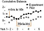 In the graph, the use of TurvyTalk seems to dominate from early in the session (even discounting task 1). We surmised that this was because Turvy's verbal feedback quickly trained users to mirror its language. Figure 9 shows a cumulative average of TurvyTalk minus bibliographic concepts computed for both pilot and experimental subject groups. The running sum is divided by the number of events (so far) in which the user concepts count is non-zero. This measurement has the following nice properties: co-occurrences of user concepts and TurvyTalk cancel each other out; events at which user concepts dominate are highlighted by a sudden drop in the score; and events containing small amounts of TurvyTalk but no user concepts increase the score. A score above zero indicates that TurvyTalk is dominating overall.