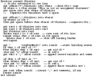 For the line transformation subtask, this obstacle never became an issue because the inaccessible data and operators obstacle alone prevented automating the subtask. But had data and operators been accessible, the effort of entering the algorithm would be a serious obstacle with many programming systems. For example, assume the program editor had a scripting language as extensive as the HyperTalk scripting language of HyperCard. Figure 2 shows a HyperTalk script that will automate the line transformation subtask, assuming that the line has been isolated in a variable. To make use of this HyperTalk script, the user would have to create it based on their algorithmic understanding of the subtask and physically enter it into the scripting system's editor. Just the physical effort of typing these 1185 characters (692 characters if comments and leading blanks are not included) is likely to undermine the benefits of automating. So while textual programming languages like HyperTalk are perfectly good programming languages for many purposes, they are often too verbose to be effective just-in-time programming languages.